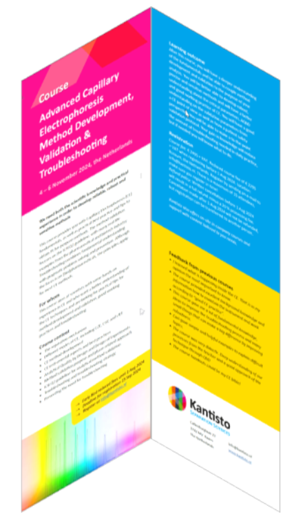 This course aims at scientists with some hands-on experience in CE and who want a better understanding of the CE techniques and are looking for practical tips for method development and validation, good working practices and troubleshooting.